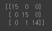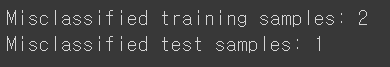 print('Misclassified test samples: %d' %(y_test!=y_test_pred).sum()) #테스트데이터로 오분류 갯수 확인