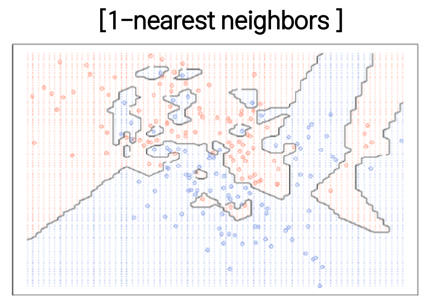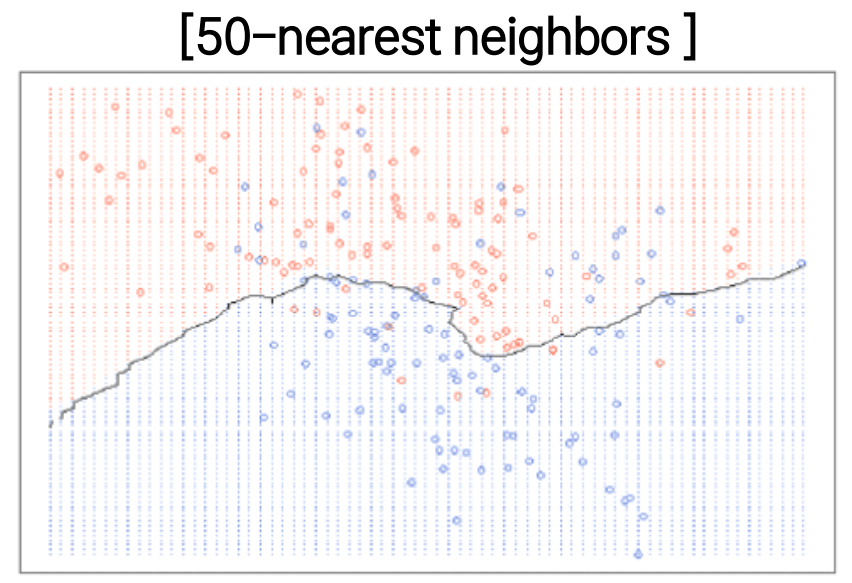 만약, k 값이 작은 경우에는 과대적합(over-fitting)이 발생할 것입니다.