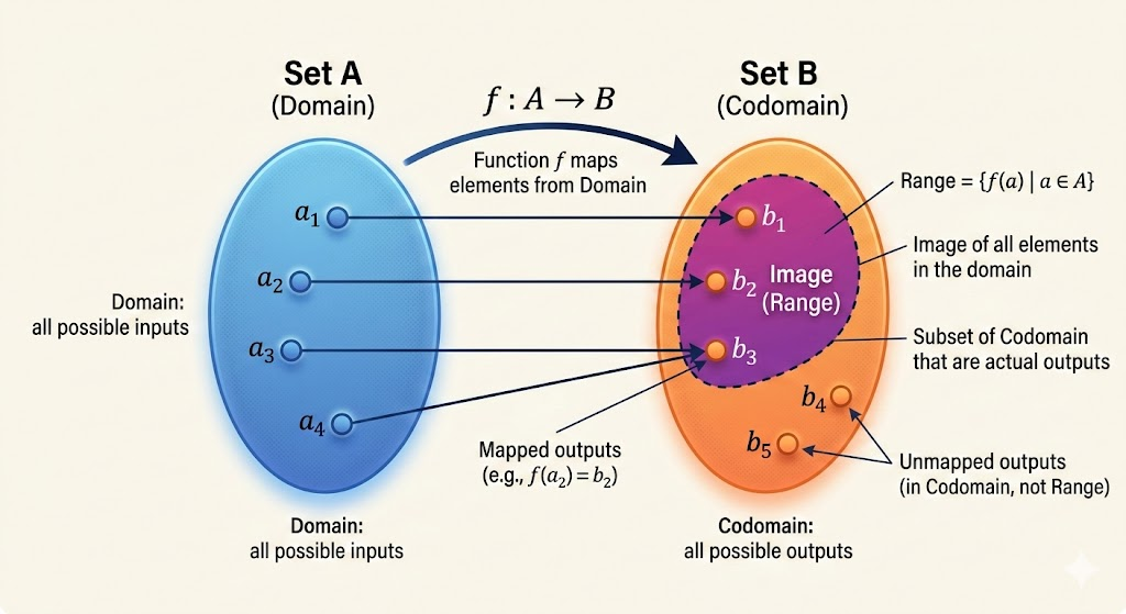 함수$T: \mathbb{R}^n \to \mathbb{R}^m$은 $ \mathbb{R}^n$의 각 벡터 $x$를 $ \mathbb{R}^m$의 벡터 $T(x)$로 대응시키는 규칙이다. 이때 $ \mathbb{R}^n$을 도메인(Domain), $ \mathbb{R}^m$을 코도메인(Codomain)이라 한다. $T(x)$를 $x$의 이미지(image)라 하고, 모든 이미지의 집합을 치역(range)이라 한다.