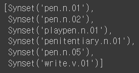 현재 WordNet에는 pen을 크게 6가지의 뜻으로 정의하고 있습니다. (정확하게는 6개의 동의어 집합이라고 할 수 있습니다.)