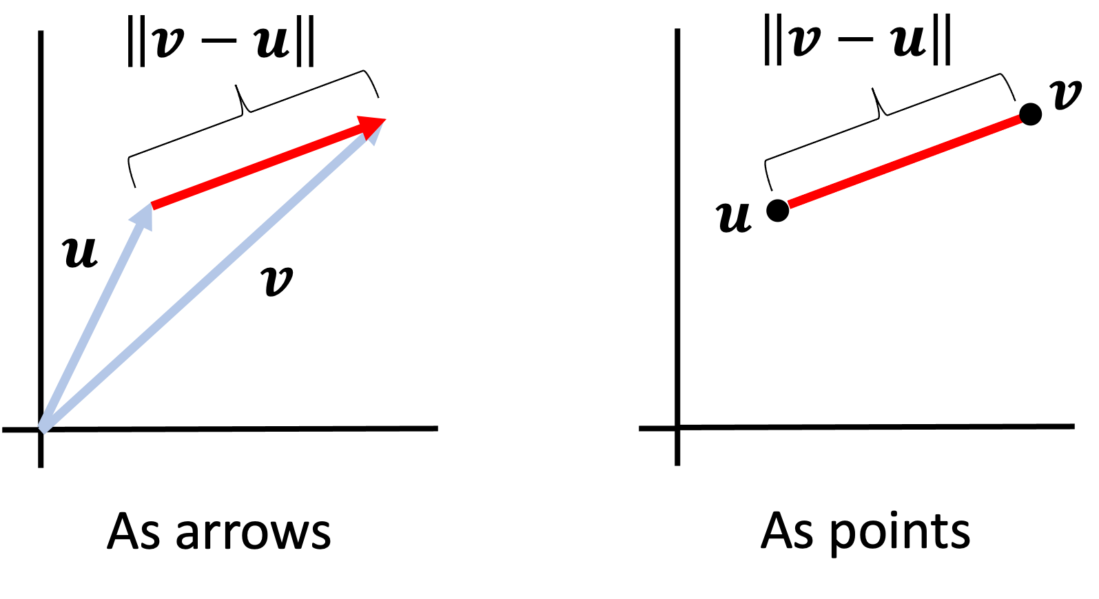 즉, 벡터 간의 거리란 두 벡터를 점으로 봤을 때의 유클리드 거리(Euclidean distance)와 같다.