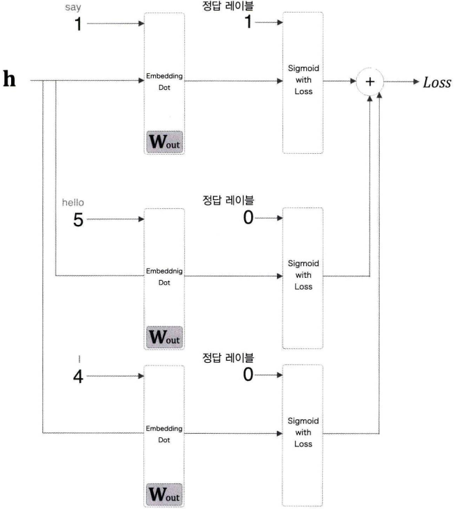 최종적으로 네거티브 샘플링은 긍정적 예를 타깃으로 한 경우의 손실을 구하면서 동시에 부정적 예를 몇 개 샘플링하여 손실을 구한 총손실을 구하는 기법이라고 할 수 있습니다.