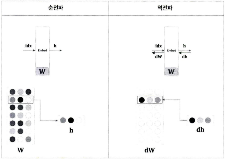 forward(순전파)에서 one hot vector로 인해 가중치의 특정 행을 다음 층으로 흘려보내기 때문에 backward(역전파)도 앞층으로부터 전해진 기울기를 다음 층의 특정행으로 흘려보내게 됩니다.