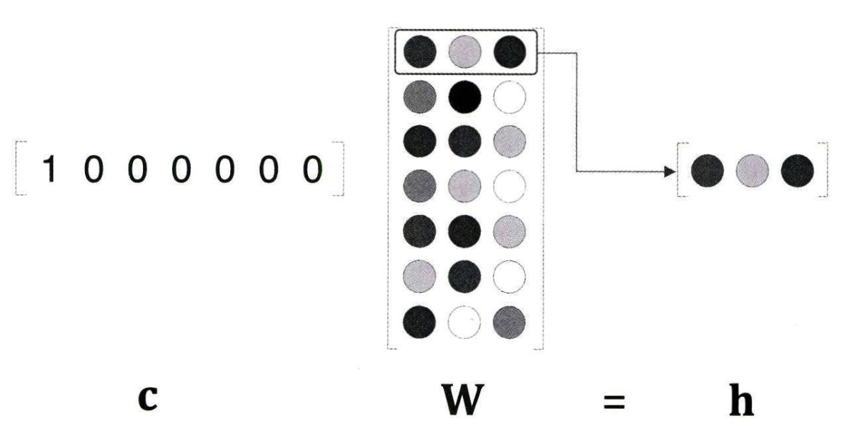 만약 특정 단어의 분산표현을 확인하려면 one-hot vector와 가중치를 곱해야 했습니다.