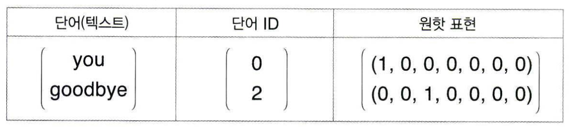 예를 들어 "You say goodbye and I say hello."라는 corpus를 one-hot encoding을 사용하면 아래와 같습니다.