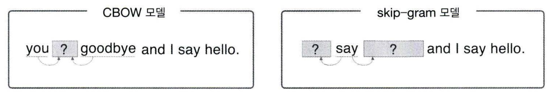 차이점이라고 하면 이전에서는 근처 단어의 횟수에 집중하였다면 여기서는 target 단어가 어떤 단어일지를 추론하는 것이라고 할 수 있습니다.