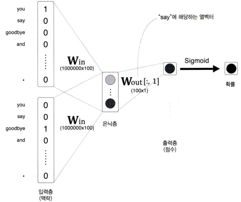 이때 target 단어에 해당하는 특정 열벡터만 추출하여 sigmooid를 통해 확률이 도출됩니다.