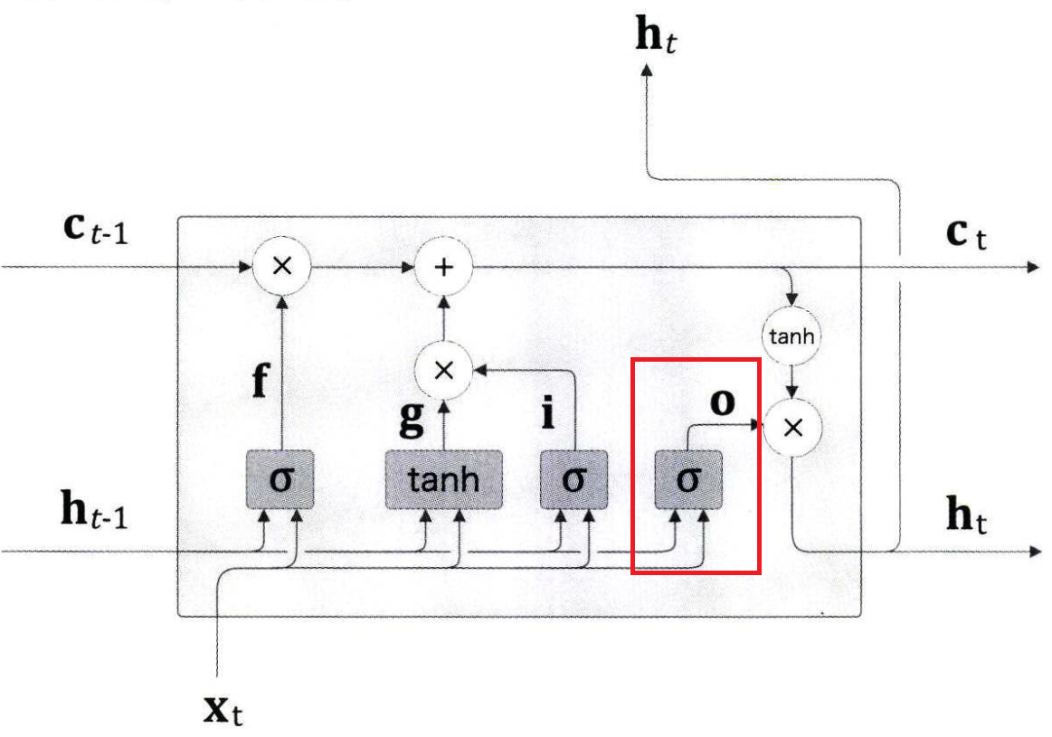 Output gate에서는 셀의 정보를 비선형화 한 데이터인 $tanh(c_{t})$가 다음 시각의 hidden state에 얼마나 중요한 가를 판단합니다.