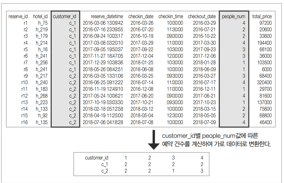# 예약 테이블에서 고객 수 및 투숙객 수에 따른 예약 건수를 세서 행을 고객 ID, 열을 투숙객 수, 값을 예약 건수인 표로 변환