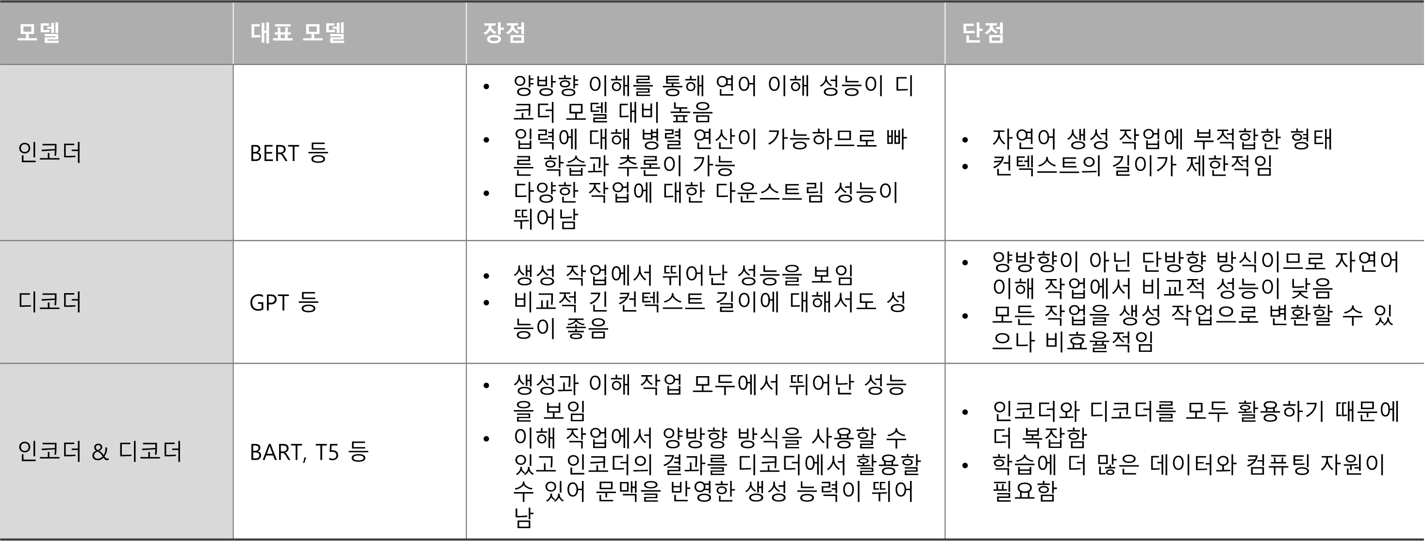 각 모델들은 서로 다른 장단점이 존재합니다.