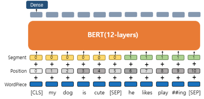 BERT에 데이터를 입력하기 전 다음 세 가지 임베딩 레이어를 기반으로 입력 데이터를 임베딩으로 변환해야 합니다.