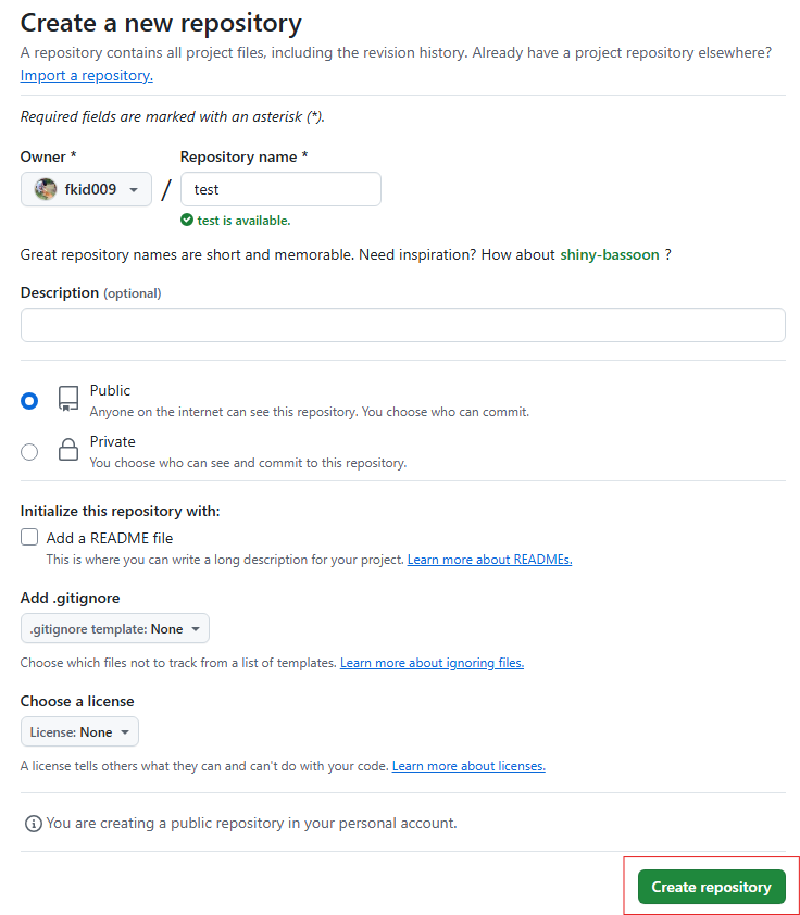 우선, 깃허브에 본인 계정으로 회원가입 후 새로운 저장소를 생성합니다.