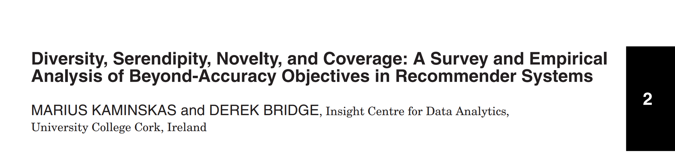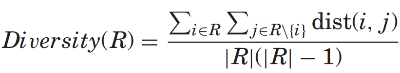 - Smyth and McClave [2001] 은 추천 목록의 diversity를 목록 내 항목들 간의 average pairwise distance로 측정하는 것을 제안하였다.