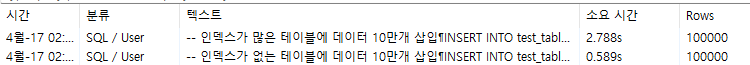 실제로 인덱스가 없는 테이블과 인덱스가 많은 테이블 간 데이터 10만 건 삽입 성능을 비교해보았을 때,
