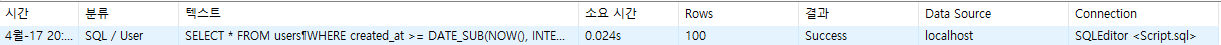 -> Index range scan on users using idx_created_at over ('2025-04-14 20:59:28' <= created_at), with index condition: (users.created_at >= <cache>((now() - interval 3 day))) (cost=471 rows=1045) (actual time=0.266..2.59 rows=1045 loops=1)