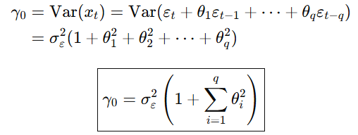이때, MA 모델의 분산은 다음과 같이 유도됩니다.