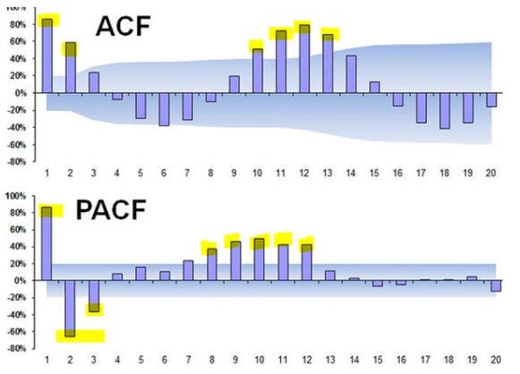 마찬가지로, 백색잡음의 신뢰구간을 벗어난 지점에서 차수를 결정합니다.