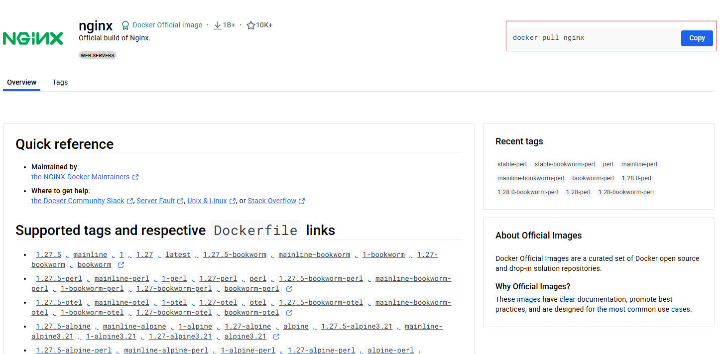 태그명(tag)은 특정 버전을 의미하며, Dockerhub에서 각 이미지의 다양한 태그를 확인할 수 있습니다.