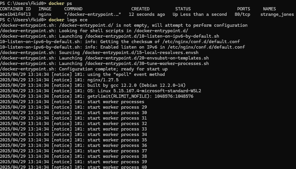 컨테이너가 실행되면서 출력한 모든 로그를 확인할 수 있습니다.