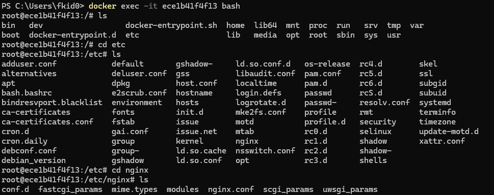 컨테이너 내부에 직접 들어가서 쉘을 열고 명령어를 실행하려면 다음과 같이 합니다: