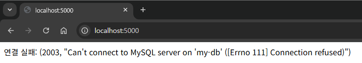 그러나 많은 분들의 경우 http://localhost:5000으로 접속하면 아래와 같이 MySQL과 접속 오류 화면이 보일 것 입니다.